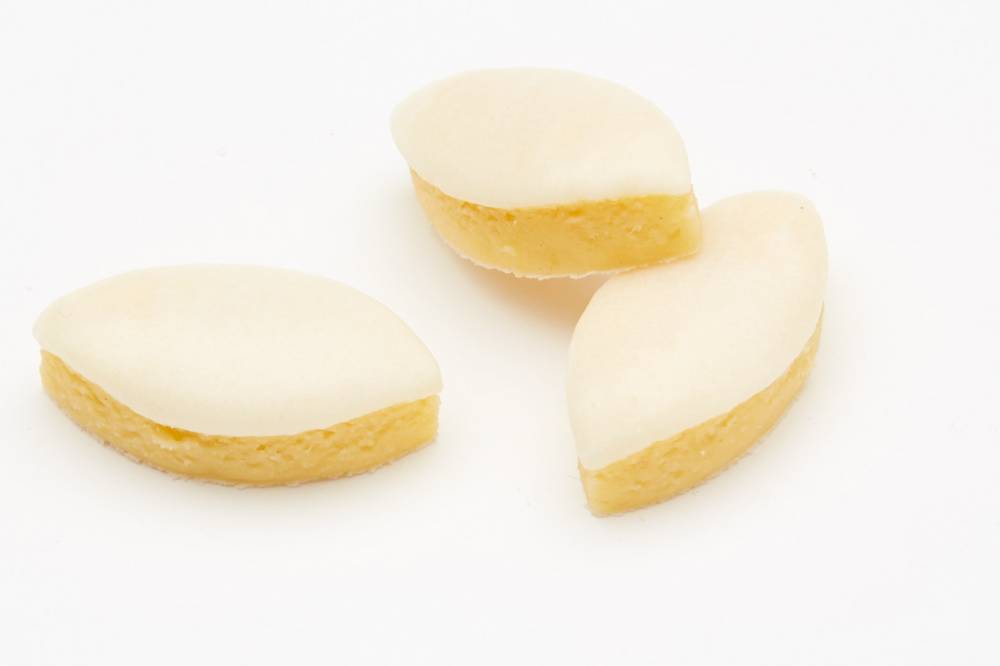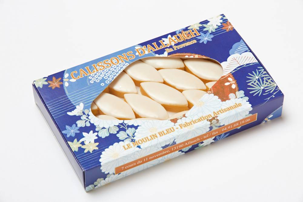 Le calisson se compose d'un subtil mélange d'amandes broyées très finement auxquelles on ajoute de l'orange et du melon confits, nappé de glaçage royal et déposé délicatement sur une feuille d'hostie.